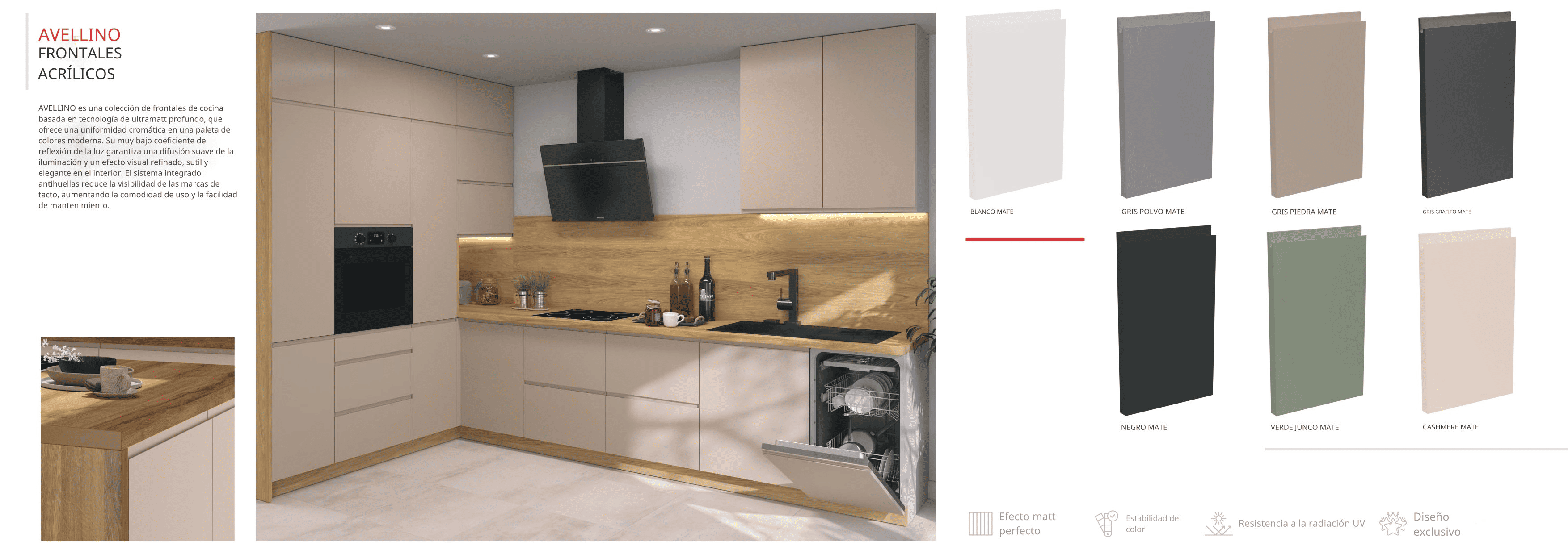 | Materiales | Laminado 16 mm / MDF 16 mm | MDF foliado / laminado 16 mm | MDF, laminados y acrílicos 18–19 mm | MDF lacado 19 mm, mates soft-touch, brillos premium |