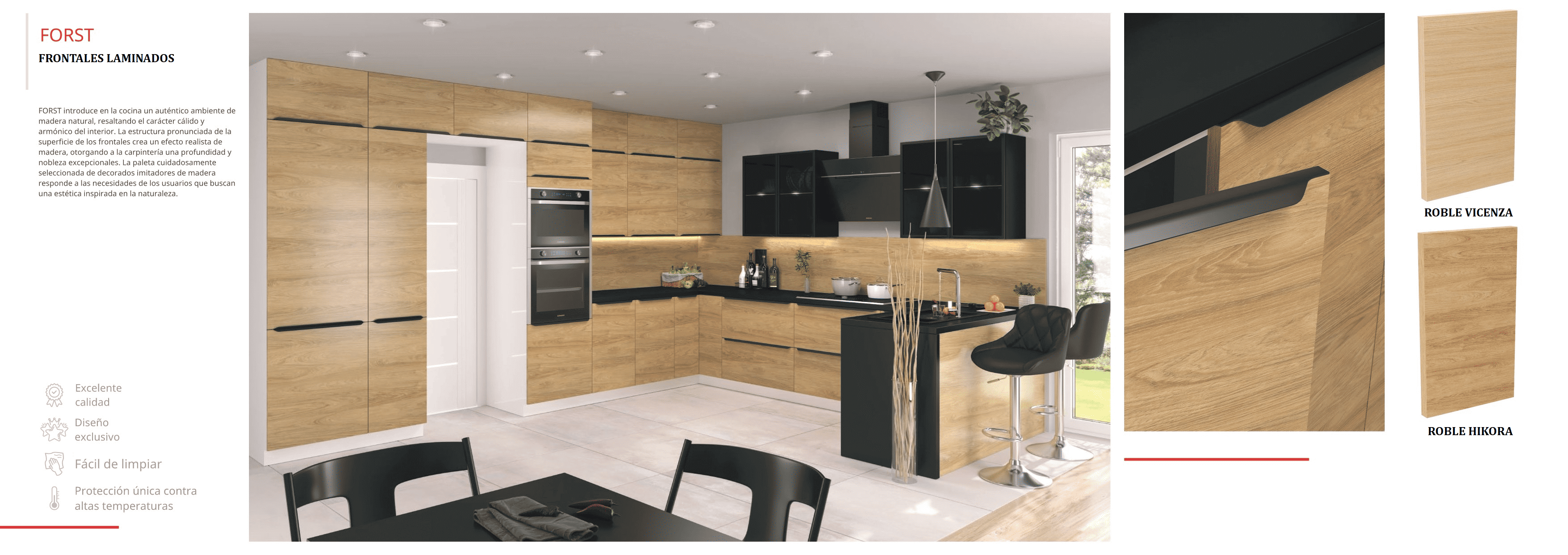 El modelo FORST aporta a la cocina una estética cálida y equilibrada inspirada en la madera natural, ideal para quienes buscan un ambiente acogedor sin renunciar a un diseño actual. Su acabado laminado de alta calidad presenta una veta visible y bien definida, que transmite naturalidad y profundidad visual. La superficie de los frontales ofrece un aspecto robusto y elegante, con una textura que recuerda a la madera auténtica y encaja perfectamente tanto en cocinas modernas como en estilos más atemporales. FORST destaca por su durabilidad en el uso diario, facilidad de limpieza y excelente comportamiento frente a la humedad y el calor. Disponible en acabados Roble Vicenza y Roble Hikora, es una opción muy valorada para quienes desean una cocina con carácter natural y una relación calidad-precio equilibrada.