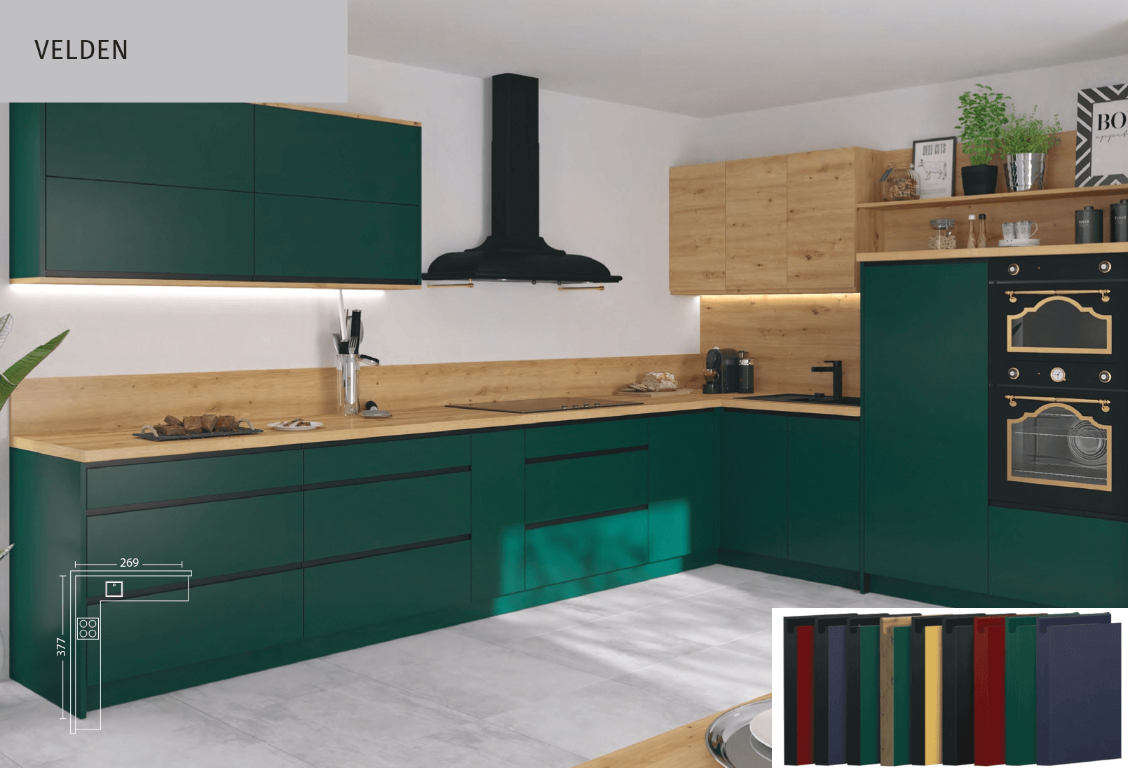 Modulos superiores e inferiores para cocina en colores super mate: negro, carmesí, azul marino, verde esmeralda, verde esmeralda y roble artesano, oro.