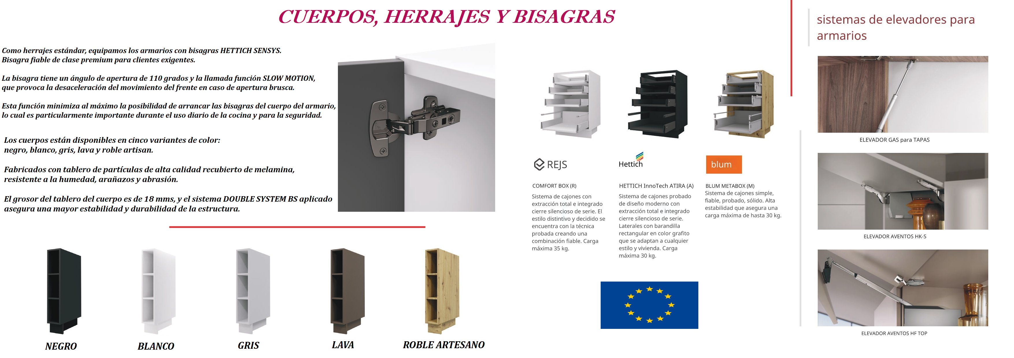 Herrajes No incluye soft-close · marca METALBOX Soft-close incluido · marca METALBOX Soft-close · marca GTV Soft-close premium + elevadores con posición regulable · marca OMNIA