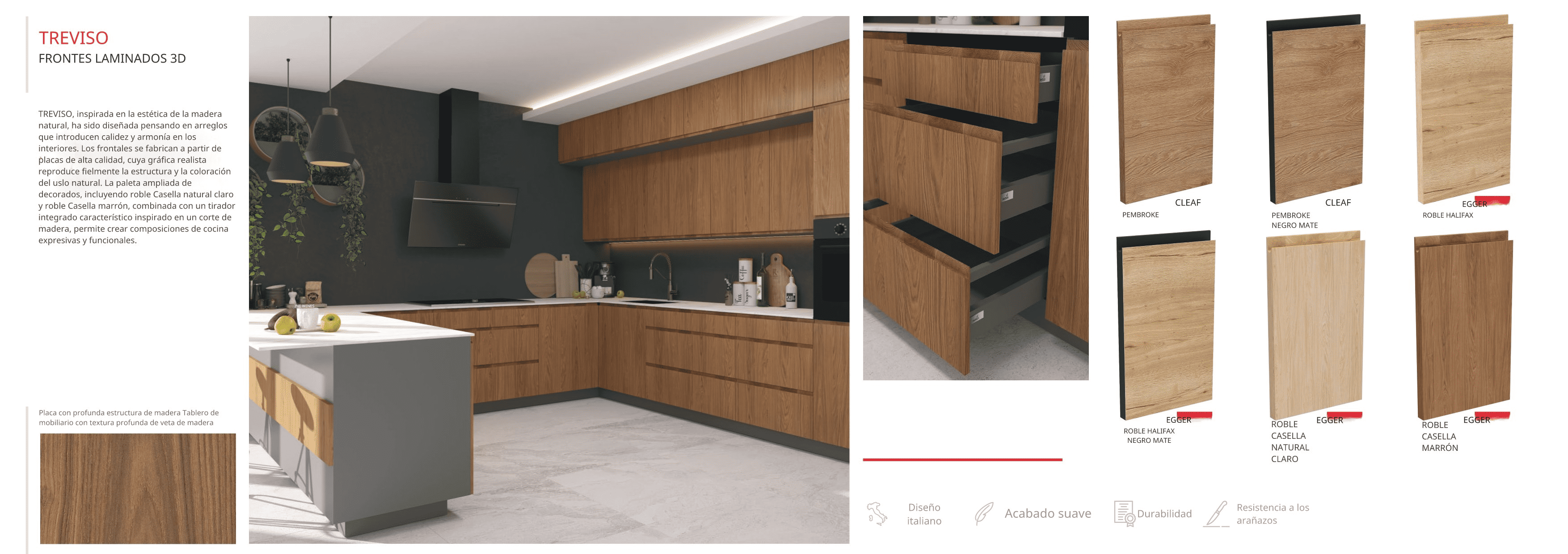 TREVISO es la combinación perfecta entre diseño italiano, calidez natural y funcionalidad, pensada para crear composiciones de cocina expresivas, equilibradas y duraderas.